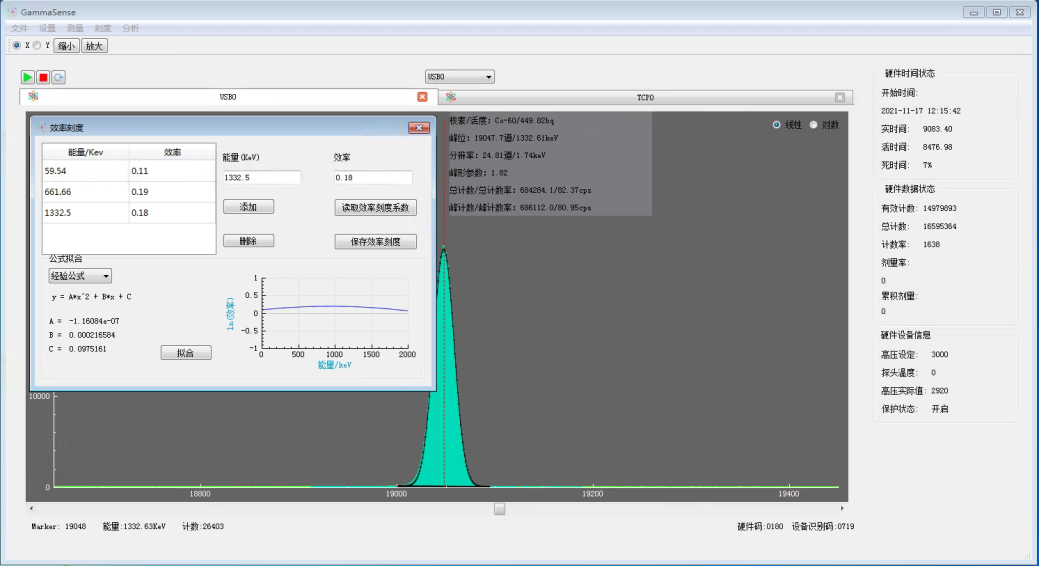 ● 本底指标:针对效率为60%的高纯锗谱仪,能量范围40keV~2MeV, 积分本底保证值≤2.5cps(1.6cps可选)。